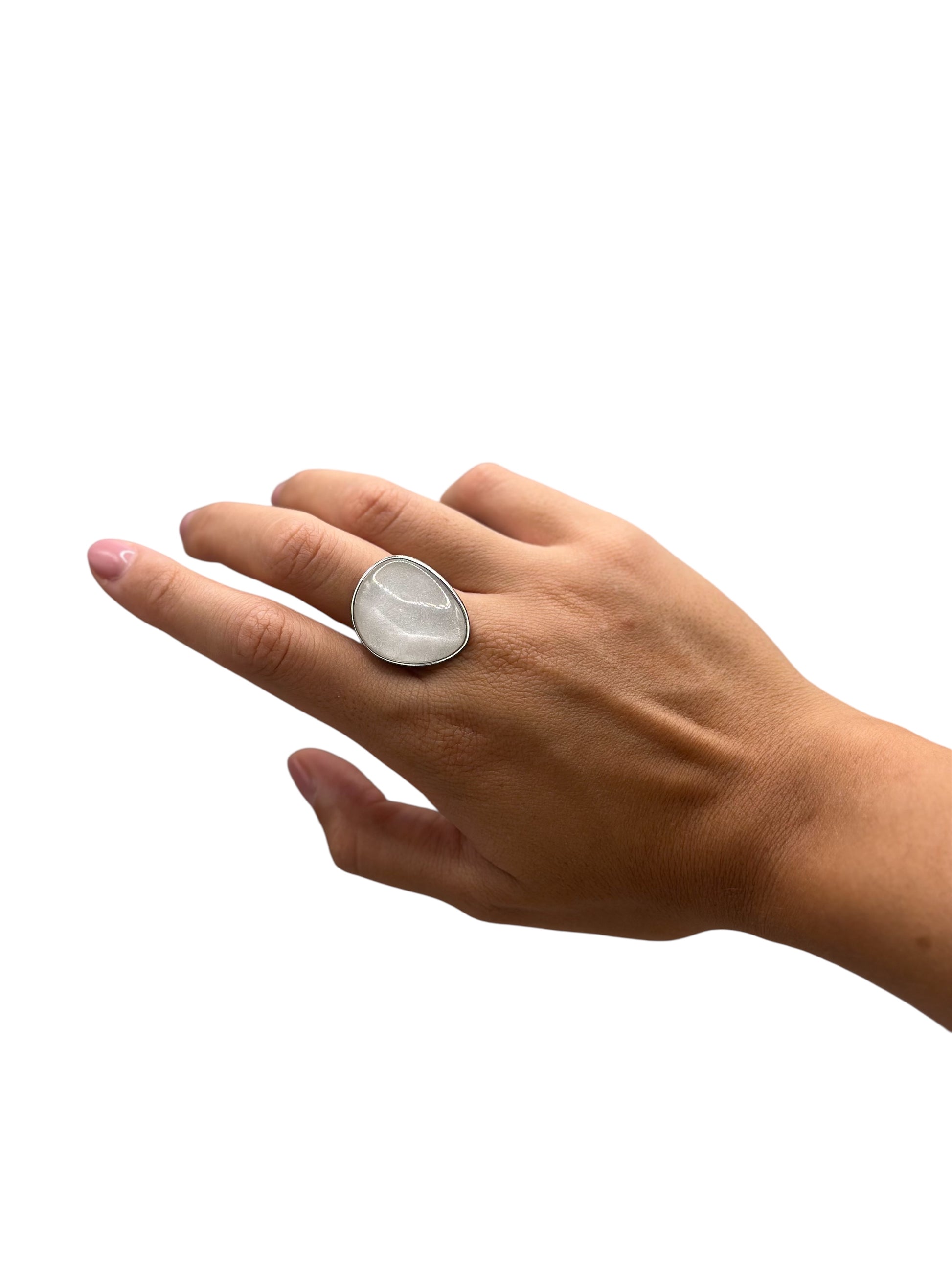 Un anello in acciaio inox con una pietra dalla superficie delicatamente bianca e perlata che cattura la luce con naturalezza.