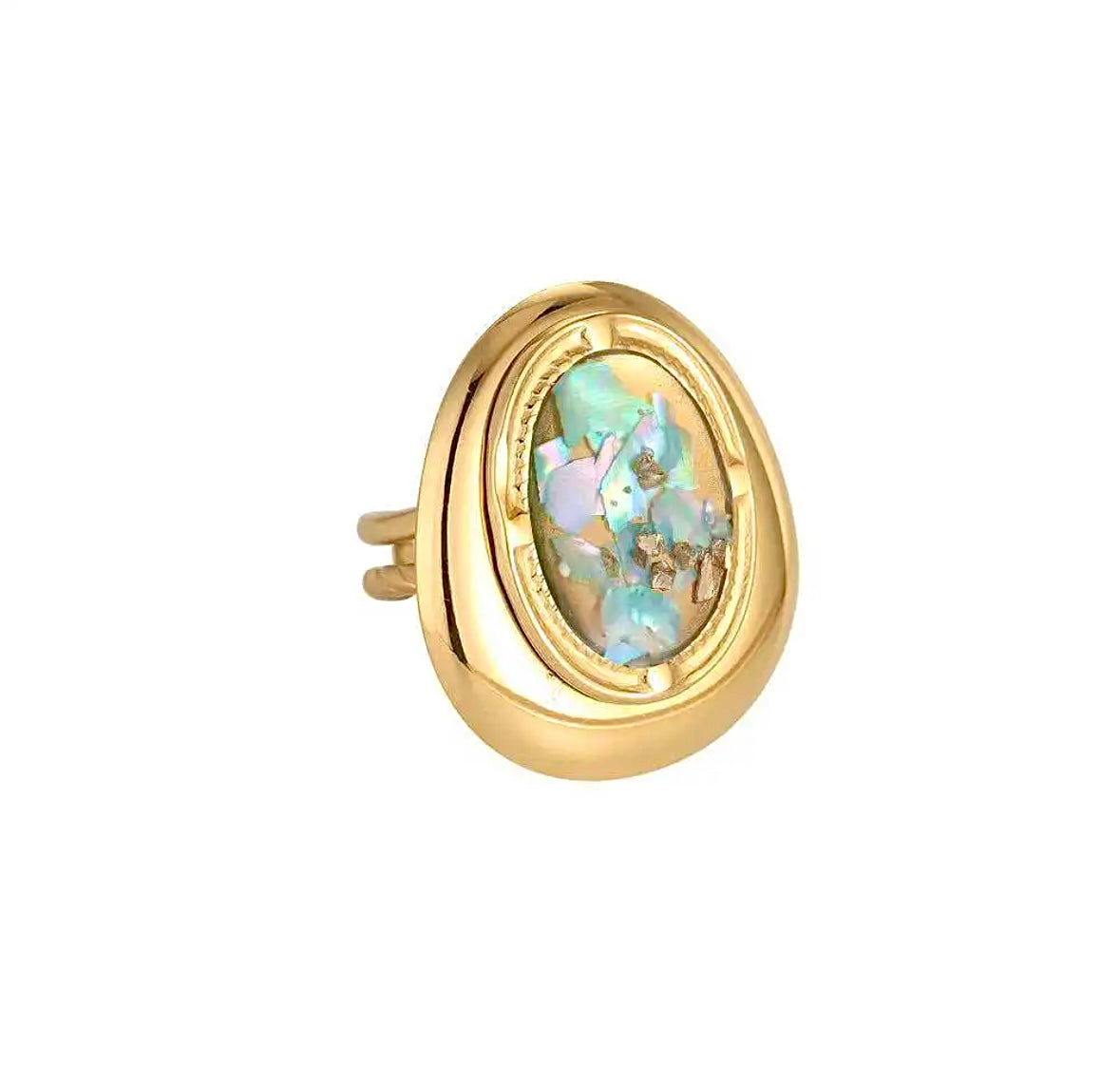 Anello in acciaio inox dorato con incastonata una pietra iridescente dai riflessi cangianti. Ogni sfumatura richiama la bellezza e la femminilità, rendendo Venere un gioiello raffinato e unico, simbolo di eleganza senza tempo e amore eterno.