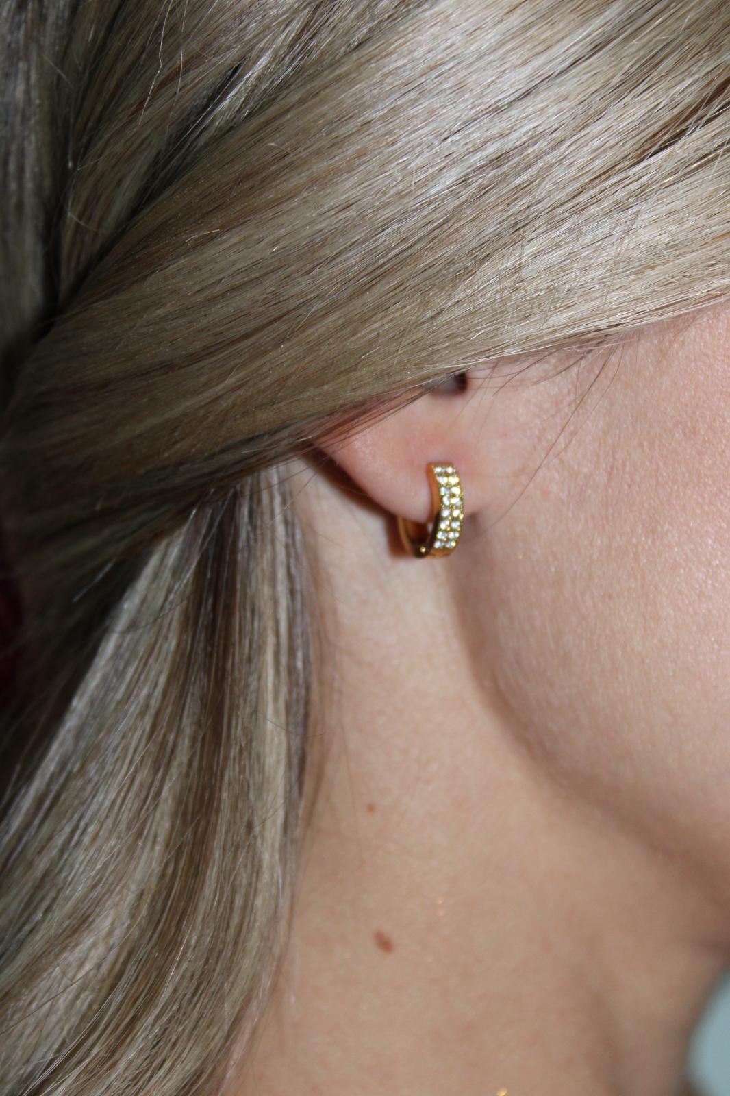 Orecchini a cerchio in acciaio inox, disponibili in versione dorata e argentata, impreziositi da due file parallele di luminosi cristalli.